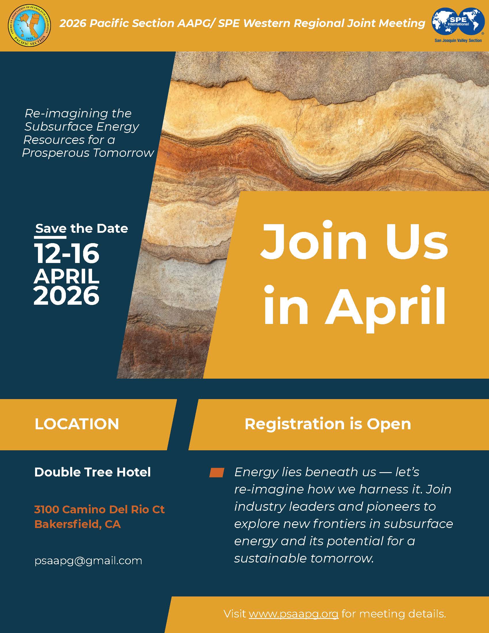 We are pleased to announce the 2026 Pacific Section AAPG/SPE Western Regional Joint Meeting. Click the image below or visit sjv.spe.org to become a sponsor, register or find other information.